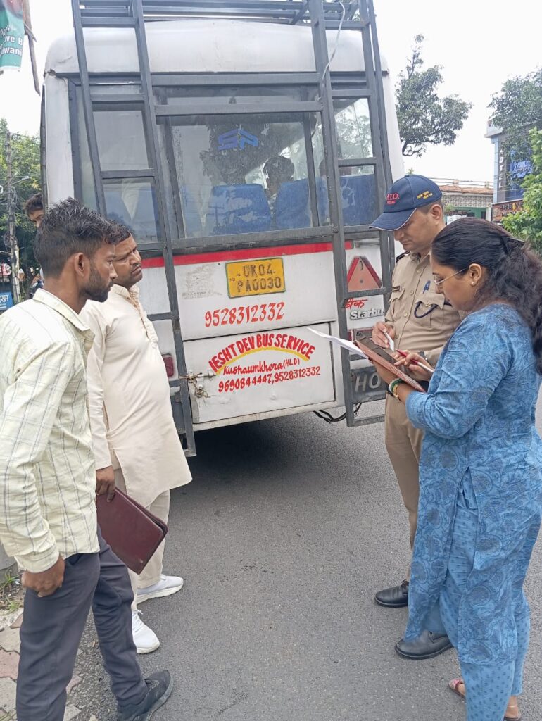 सहायक संभागीय परिवहन अधिकारी (प्रवर्तन) जितेंद्र सांगवान, परिवहन कर अधिकारी अनुभा आर्य, अपराजिता पांडे, परिवहन निरीक्षक नंदन रावत, रामचंद्र पवार, गिरीश कांडपाल के द्वारा हल्द्वानी, कालाढूंगी, नैनीताल, बरेली मार्ग पर बस, ट्रक, टैक्सी, मैक्सी, ई रिक्शा, ऑटो, मोटरसाइकिल, कार आदि वाहनों को चेकिंग करते हुए कर, फिटनेस, परमिट, टैक्स, हेलमेट, ओवरलोडिंग, वाहनों की यांत्रिक स्थिति ठीक ना होना, परमिट शर्तों का उल्लंघन, चालकों के द्वारा निर्धारित यूनिफॉर्म न पहनना, सीट बेल्ट, ओवरस्पीड आदि अभियोग में प्रवर्तन कार्रवाई की।