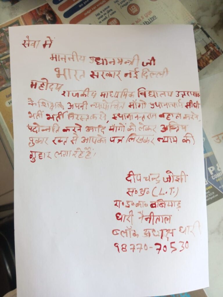 हल्द्वानी : राजकीय शिक्षक संघ के ब्लॉक अध्यक्ष धारी दीप चंद्र जोशी ने शिक्षकों की मांगों को लेकर प्रधानमंत्री नरेंद्र मोदी को खून से लिखा पत्र भेजा है। राजकीय शिक्षक संघ उत्तराखंड अपनी मांगों को लेकर लगातार आंदोलनरत है। लेकिन अभी तक उनकी मांगों पर कोई सकारात्मक निर्णय नहीं लिया गया है। विरोध प्रदर्शन के साथ ही शिक्षक छात्र हित में सभी शिक्षण कार्य कर रहे हैं।राजकीय शिक्षक संघ के जिलाध्यक्ष नैनीताल गिरीश चंद जोशी ने बताया कि मांगें मनवाने के लिए हर स्तर पर प्रयास जारी रहेगा। जब तक प्रधानाचार्य सीधी भर्ती निरस्त नहीं होती तब तक आंदोलन जारी रहेगा।