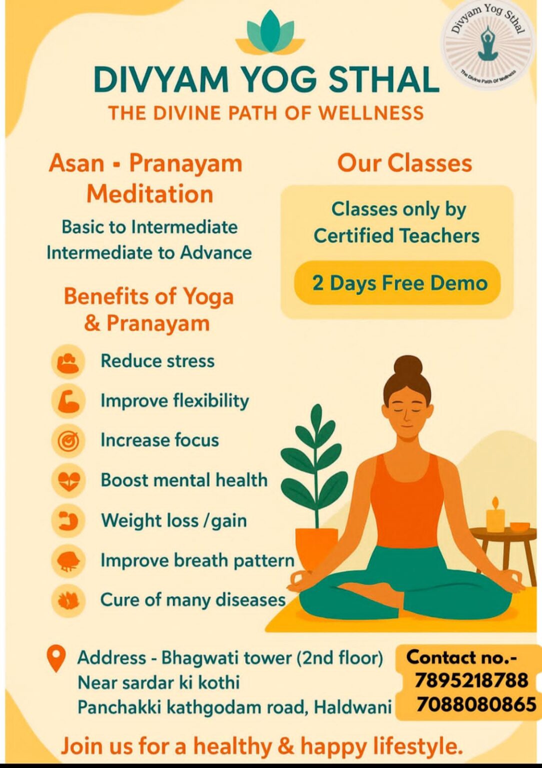 हल्द्वानी : शहरवासियों के लिए अच्छी खबर है। अब योग, ध्यान और फिटनेस से जुड़ा एक नया और आधुनिक योग स्टूडियो खुलने जा रहा है। दमुआढूंगा पनचक्की चौराहे से आगे सरदार की कोठी के पास जल्द ही ‘दिव्यम योग स्थल’ की शुरुआत होने वाली है। यहां पर योगासन के साथ मेडिटेशन और बेसिक एक्सरसाइज की विशेष ट्रेनिंग दी जाएगी। खास बात यह है कि सभी क्लासेज एक रजिस्टर्ड योग ट्रेनर की देखरेख में होंगी।👉 उद्घाटन के मौके पर 2 दिन की फ्री डेमो क्लासेज भी उपलब्ध रहेंगी।👉 नियमित क्लासेज की फीस भी किफायती रखी गई है ताकि हर कोई आसानी से जुड़ सके।अधिक जानकारी और रजिस्ट्रेशन के लिए इन नंबरों पर संपर्क करें –📞 7895218788, 7088080865