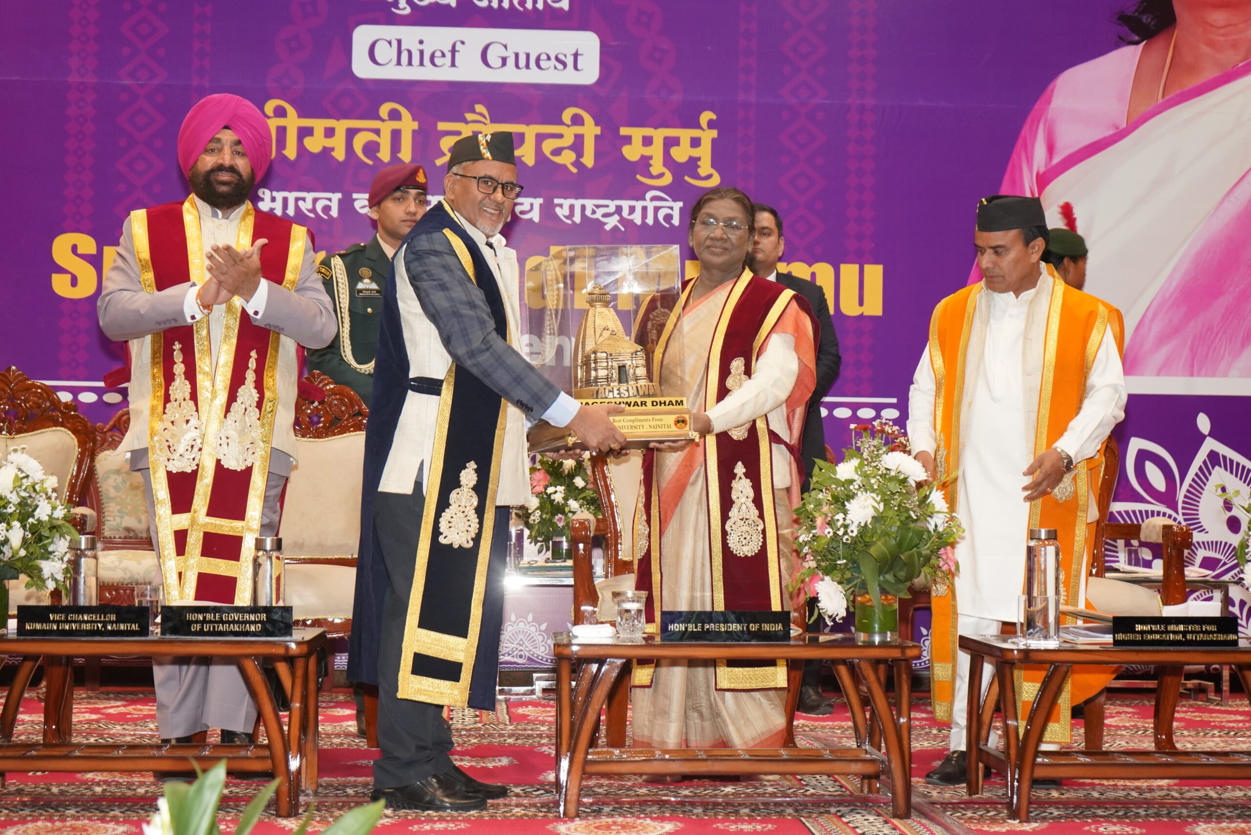 नैनीताल। भारत की राष्ट्रपति श्रीमती द्रौपदी मुर्मु ने कुमाऊँ विश्वविद्यालय, नैनीताल के 20वें दीक्षांत समारोह में बतौर मुख्य अतिथि प्रतिभाग किया। इस दौरान राष्ट्रपति ने उत्कृष्ट प्रदर्शन करने वाले विद्यार्थियों को गोल्ड मेडल और उपाधियां प्रदान की।इस अवसर पर राज्यपाल लेफ्टिनेंट जनरल गुरमीत सिंह (से नि) भी उपस्थित रहे। दीक्षांत समारोह को संबोधित करते हुए राष्ट्रपति ने कहा कि शिक्षा किसी भी राष्ट्र के विकास की नींव होती है। इसलिए, शिक्षा का उद्देश्य केवल विद्यार्थियों की बुद्धि और कौशल का विकास करना ही नहीं, बल्कि उनके नैतिक बल और चरित्र को भी सुदृढ़ करना होना चाहिए।राष्ट्रपति ने कहा कि शिक्षा हमें आत्मनिर्भर बनाती है, साथ ही हमें विनम्र होना और समाज व देश के विकास में योगदान देना सिखाती है। उन्होंने विद्यार्थियों से आग्रह किया कि वे अपनी शिक्षा को वंचित वर्गों की सेवा और राष्ट्र निर्माण के कार्य में समर्पित करें। उन्होंने कहा कि यही सच्चा धर्म है, जो उन्हें सच्चा सुख और संतोष प्रदान करेगा।राष्ट्रपति ने कहा कि भारतीय अर्थव्यवस्था विश्व की सबसे तेजी से विकसित होती प्रमुख अर्थव्यवस्थाओं में से एक है। सरकार निरंतर प्रगति सुनिश्चित करने के लिए अनेक नीतिगत पहल कर रही है। ये पहल युवाओं के लिए अनेक अवसर उत्पन्न कर रही हैं। उच्च शिक्षण संस्थानों को चाहिए कि वे युवाओं को इन अवसरों का लाभ उठाने के लिए प्रेरित करें।राष्ट्रपति ने कहा कि देश में शोध, नवाचार और उद्यमिता को बढ़ावा देना अत्यंत आवश्यक है। उन्हें यह जानकर प्रसन्नता हुई कि कुमाऊँ विश्वविद्यालय शिक्षा, अनुसंधान और नवाचार में उत्कृष्टता के प्रति समर्पित है। उन्होंने कहा कि शिक्षा और अनुसंधान के प्रभावी अनुप्रयोग के लिए बहुविषयक दृष्टिकोण अत्यंत महत्वपूर्ण है। उन्हें विश्वास है कि विश्वविद्यालय इस दिशा में निरंतर अग्रसर रहेगा।राष्ट्रपति ने कहा कि हिमालय अपनी जीवनदायिनी संपदाओं के लिए जाना जाता है। इन संसाधनों का संरक्षण और संवर्धन हम सभी की सामूहिक जिम्मेदारी है। उन्हें यह जानकर प्रसन्नता हुई कि कुमाऊँ विश्वविद्यालय पर्यावरण संरक्षण के क्षेत्र में जागरूक प्रयास कर रहा है।राष्ट्रपति ने कहा कि एक शिक्षण संस्था के रूप में कुमाऊँ विश्वविद्यालय की कुछ सामाजिक जिम्मेदारियाँ भी हैं। उन्होंने विश्वविद्यालय के अध्यापकों और विद्यार्थियों से आग्रह किया कि वे आस-पास के गाँवों में जाएँ, वहाँ के लोगों की समस्याओं को समझें और उनके समाधान के लिए हर संभव प्रयास करें।राष्ट्रपति ने कहा कि वर्ष 2047 तक भारत को एक विकसित राष्ट्र बनाने का लक्ष्य रखा है। इस लक्ष्य की प्राप्ति में कुमाऊँ विश्वविद्यालय जैसे संस्थानो